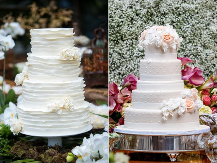 O bolo de casamento é um dos itens mais importantes do cardápio e precisa ser escolhido com bastante cuidado. Não escolha apenas pela aparência. Lembre-se que ele deve ser, além de lindo, muito gostoso. A dica para não errar é sempre levar em conta o estilo da festa na hora de escolher a decoração do bolo de casamento. Para quem gosta do estilo romântico, um bolo branco ou em tonalidades claras, decorado com flores de açúcar ou laços feitos com pasta americana, pode ser uma ótima escolha. Outra opção que está atualmente entre as preferidas das noivas são os bolos rendados ou cobertos com buttercream texturizado. Se você preferir o estilo mais moderno poderá optar por uma cobertura com cores mais fortes ou até mesmo um bolo branco com detalhes na cor preta ou chocolate. Em uma festa mais descontraída, bolos com detalhes coloridos e noivinhos personalizados fazem toda diferença.